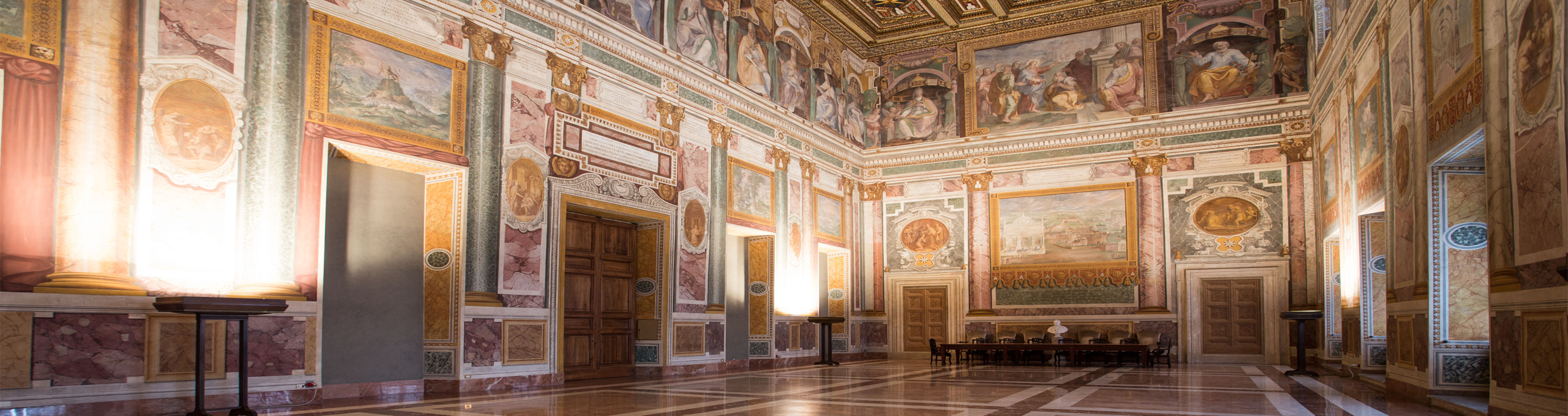 Les plafonds datent de l'époque Sixtine et célèbrent le thème victorieux de la Résurrection de Notre-Seigneur. Le riche sol en majolique, au parfum vaguement Renaissance, appartient à la production italienne moderne et a été installé lors de la profonde restauration de l'ensemble du palais au début des années 1960.
